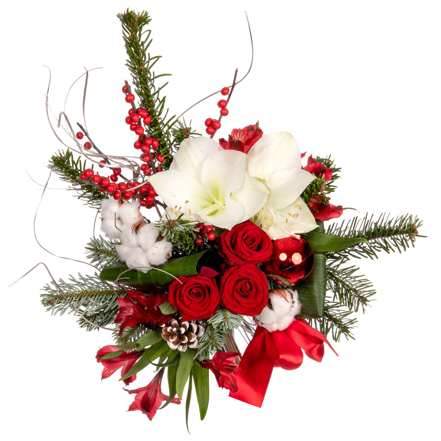 Amarillos, Ilexes, Alstroemerias, Roses, Cotton, Decorative bow & Decorative greenery (11 stems)
