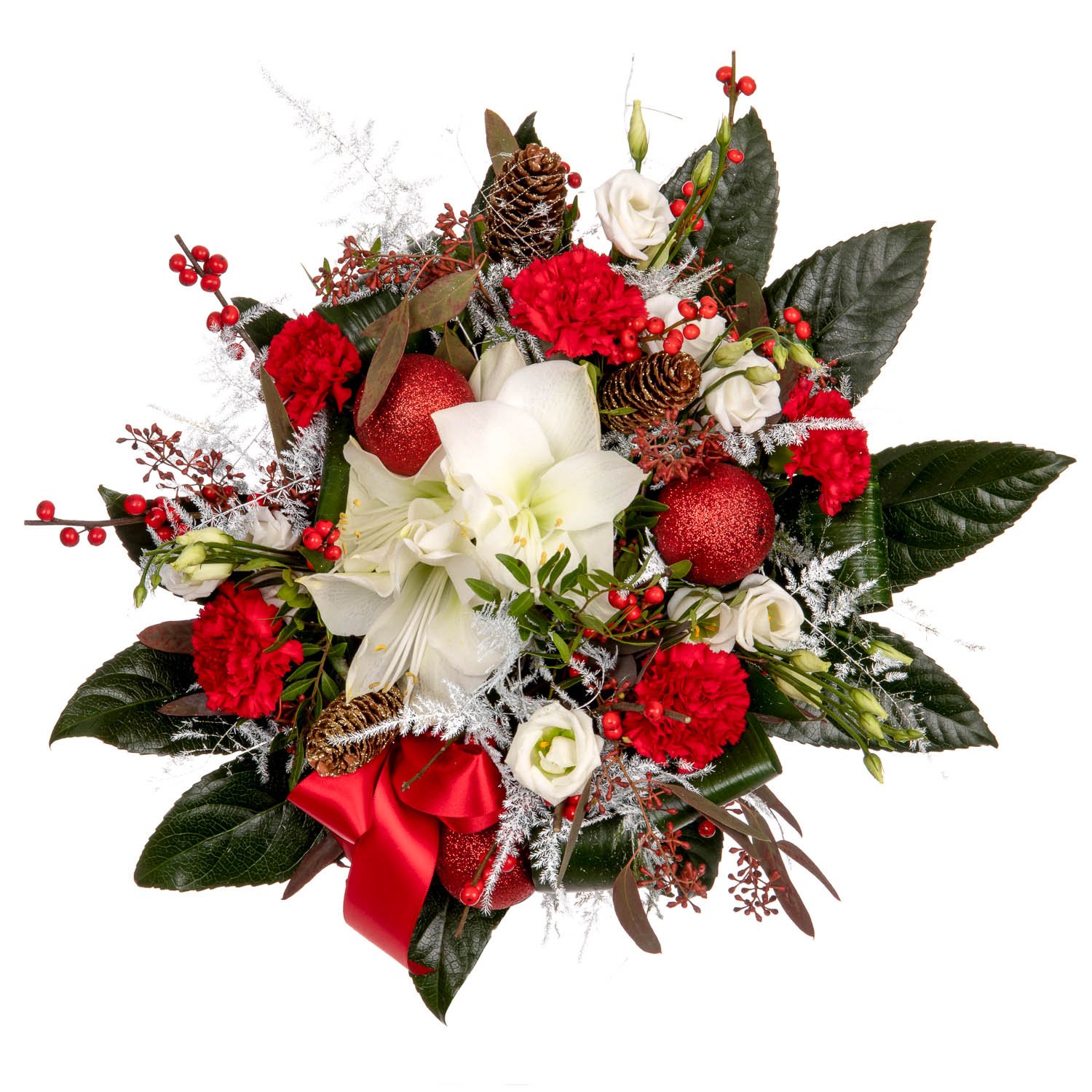 Amarillos, Ilexes, Carnations, Lisianthus, Decorative bow & Decorative greenery (13 stems)